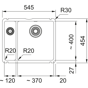 Su 3 1/2 ventiliu pagrindiniame dubenyje ir rankiniu ventiliu. Dydis 545*445 mm, montuojama po stalviršiu.