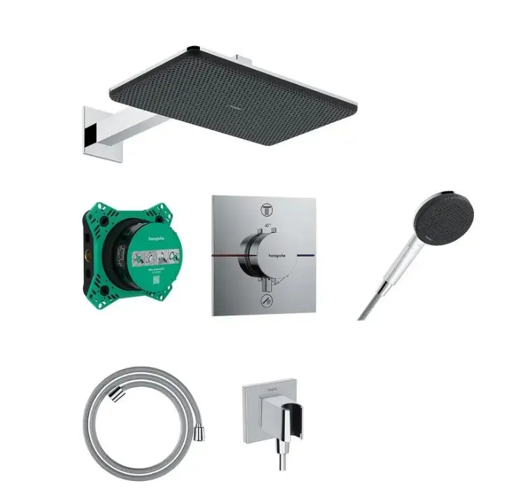 • Lietaus dušo galva 214×343 mm , dušo alkūnė, rankinis dušas, dušo laikiklis, sieninis lizdas, tekstilinė dušo žarna, dušo termostatas, potinkinė dalis Ibox II